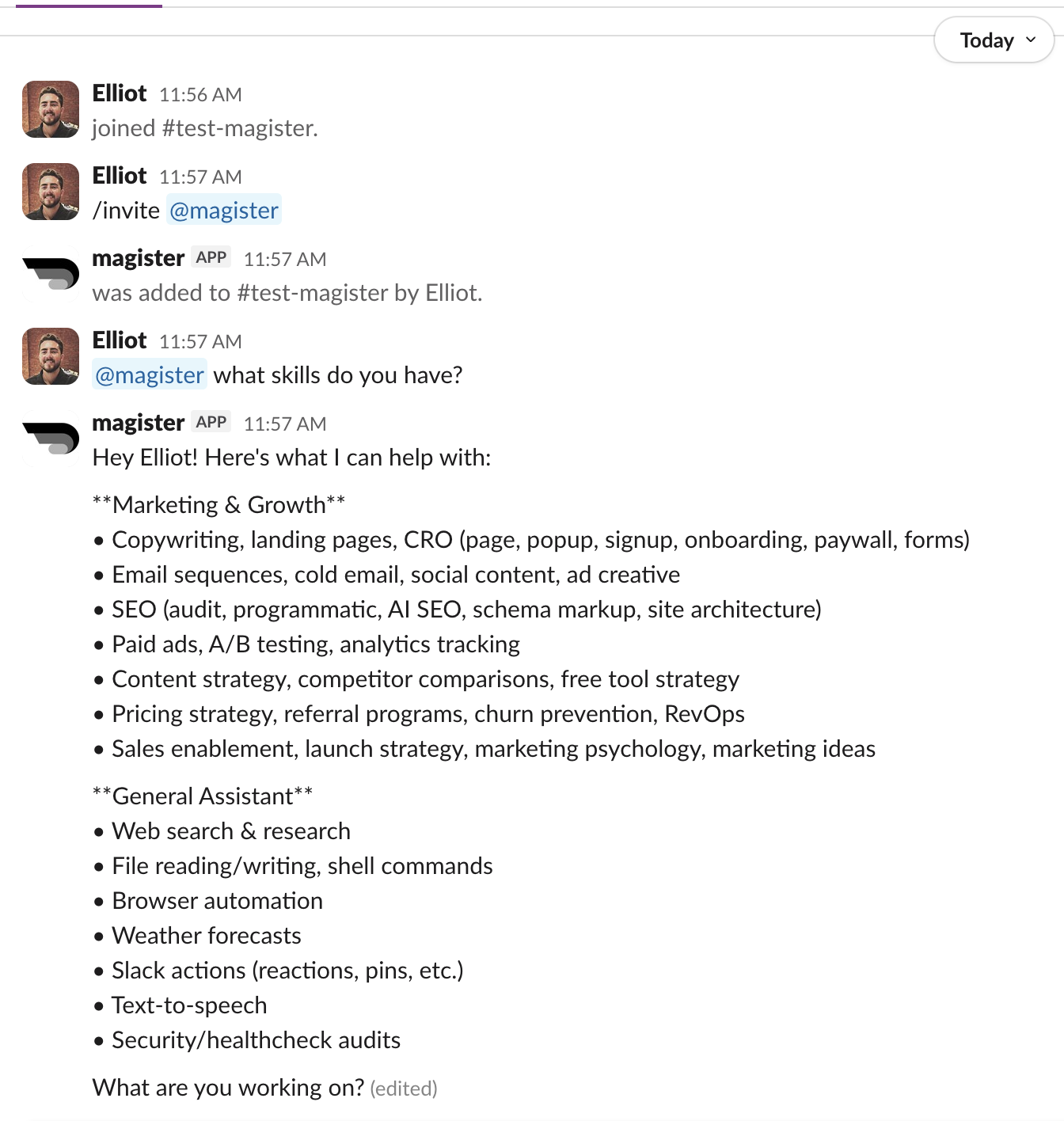 We have a working MVP — Magister is connected and running in Slack.
