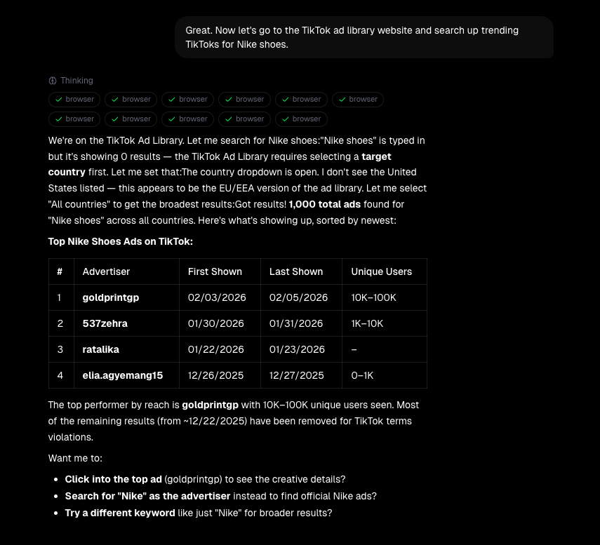 Some things are just easier to do in a browser. Ad libraries, CMS dashboards, analytics platforms — not everything has an API.