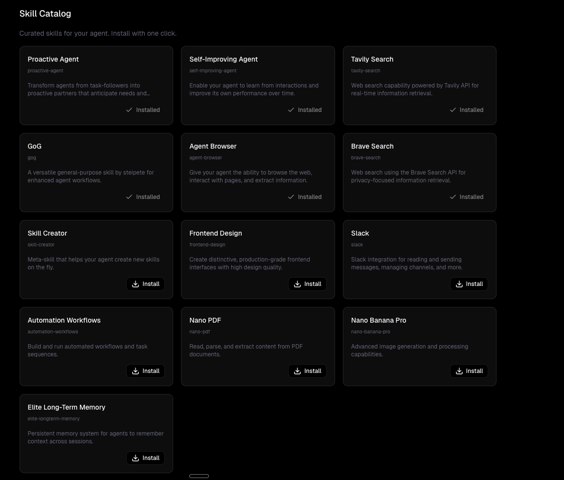 Browse the catalog, hit install, done. Your agent immediately gets new capabilities — web search, browser control, frontend design, long-term memory, workflow automation, and more.